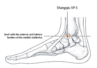 SP 5 bevindt zich aan de binnenkant van je enkel onder het prominente bot (zie tekening).